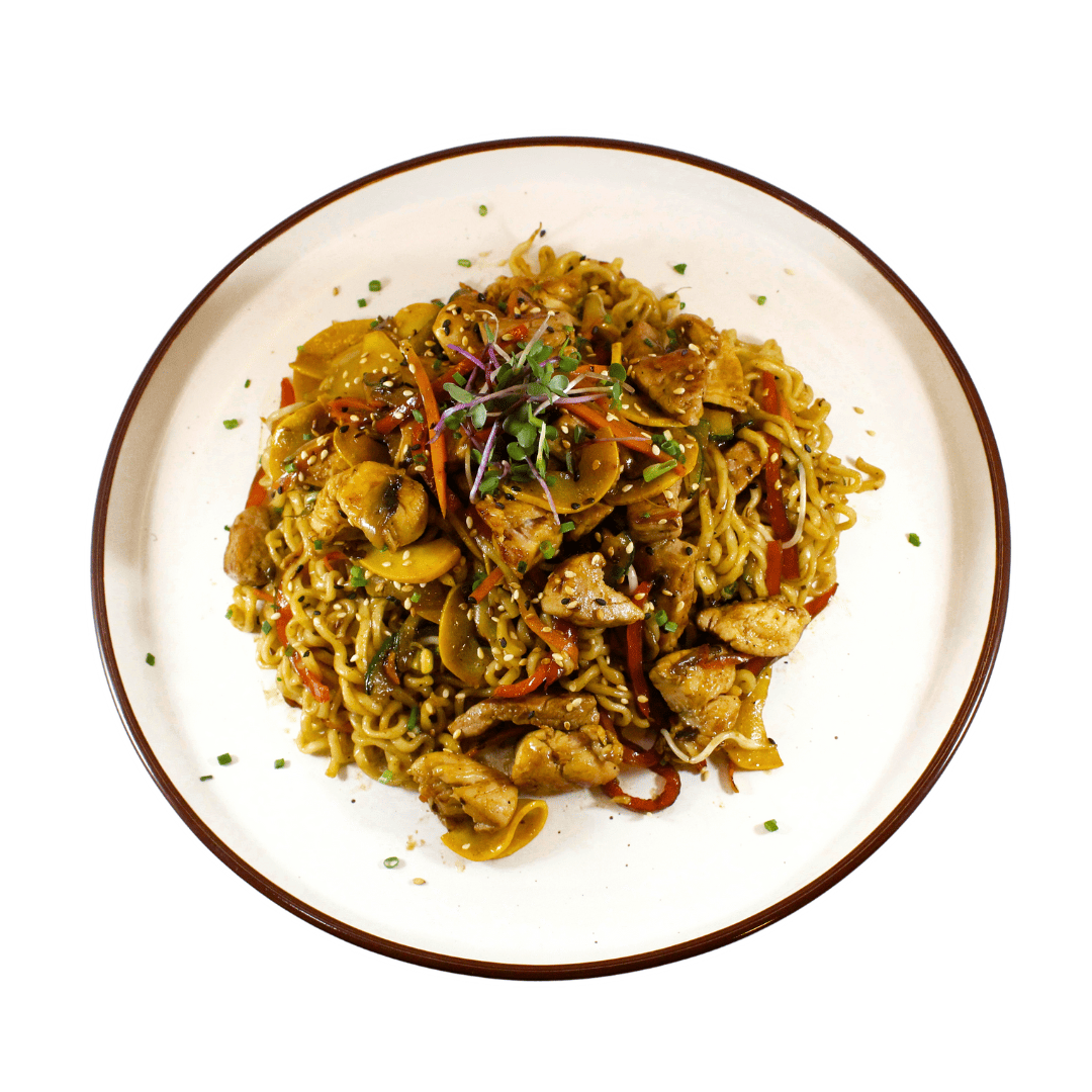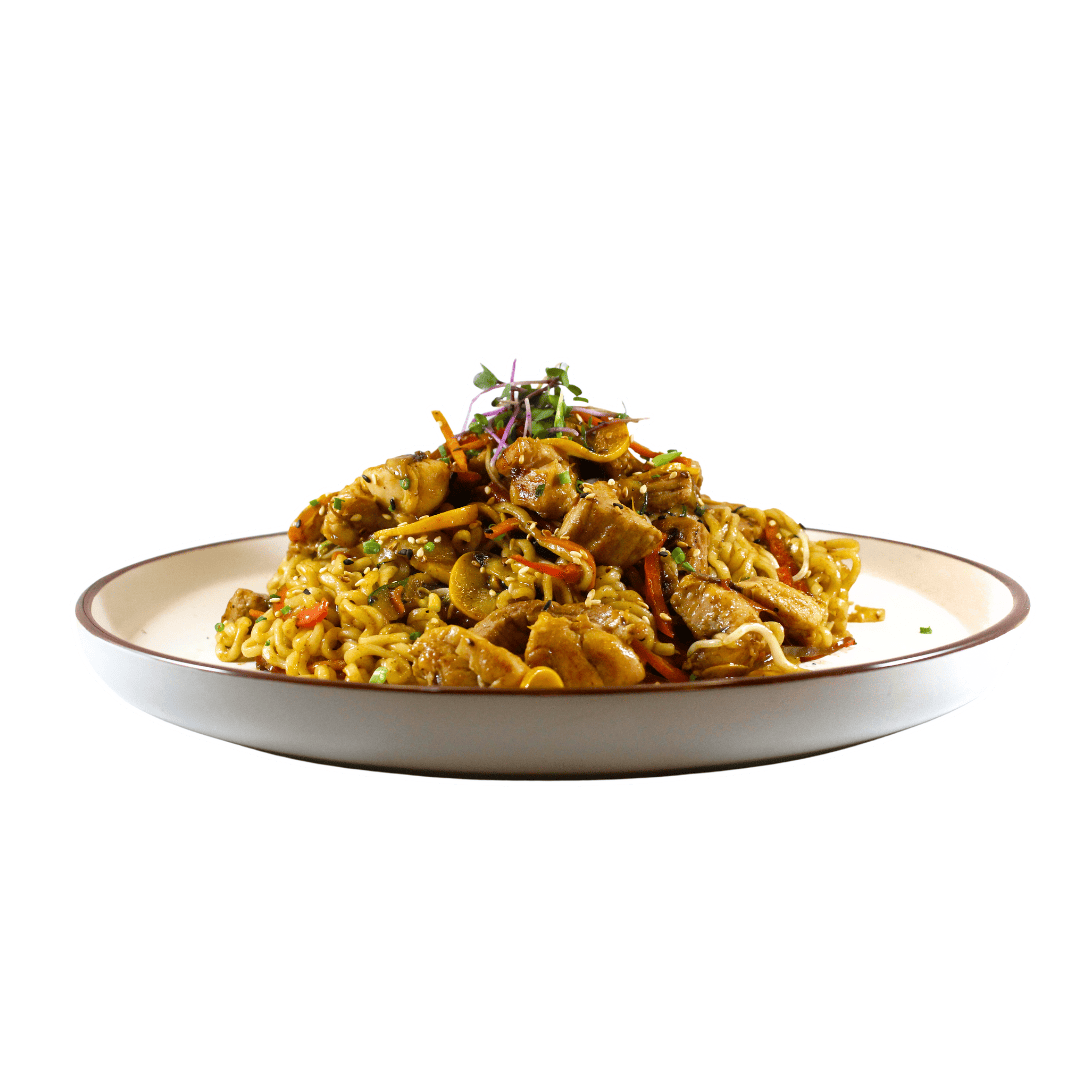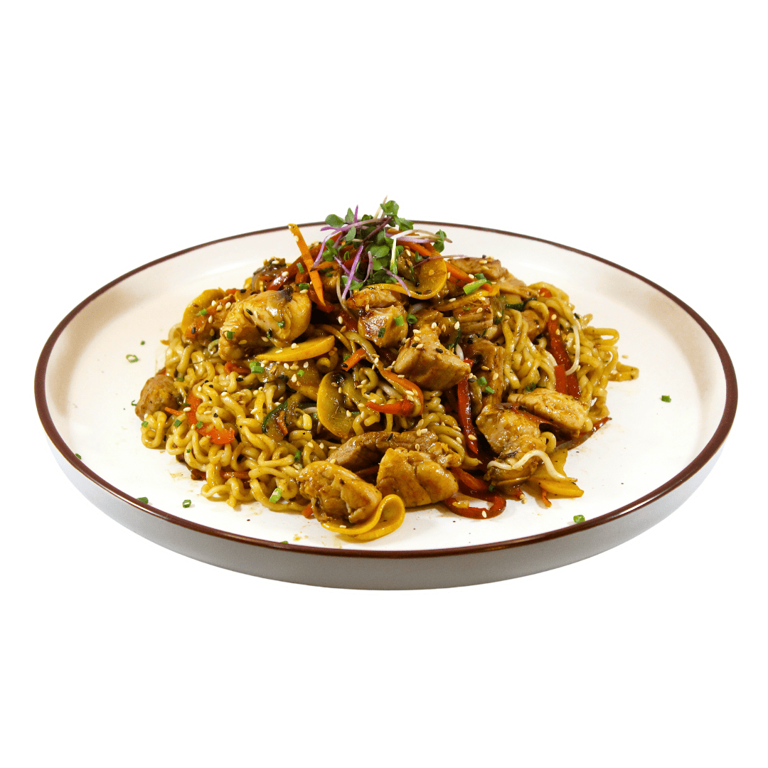 Pasta tipo yakisoba salteada con pollo y cerdo, vegetales, champiñon paris, vino blanco.